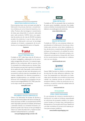 16INDUSTRIAS QU%u00cdMICAS KUPSA, SLEsta empresa tiene como principal actividad la fabricaci%u00f3n de pinturas, barnices y revestimientos similares, as%u00ed como tintas de imprenta y masillas. Produce alta tecnolog%u00eda en revestimiento de latas para desarrollar la soluci%u00f3n adecuada para cada producto. KUPSA tiene una capacidad de producci%u00f3n de m%u00e1s de 30.000 toneladas anuales de productos, lo que la sit%u00faa, tanto en volumen de fabricaci%u00f3n como por la tecnolog%u00eda utilizada en el dise%u00f1o y preparaci%u00f3n de los productos, en la vanguardia del sector en Espa%u00f1a.kupsa.esJALLUT PINTURAS, SLUFundada en 1977, Jallut lleva m%u00e1s de 40 a%u00f1os en el sector metalgr%u00e1fico, colaborando con los principales protagonistas del sector. Con presencia geogr%u00e1fica en tres continentes, Jallut se asume como un proveedor de confianza para sus clientes. Dotados de equipos que permiten reproducir la totalidad de la cadena de valor (barnizado, conformaci%u00f3n de envases y ensayos de pack test alimentarios, etc.), encuentra la soluci%u00f3n para las necesidades de sus clientes, colaborando con distintos proveedores y agentes complementarios a su actividad. La constancia en I+D+i ha llevado a la compa%u00f1%u00eda a ser pionera en la tecnolog%u00eda BPANI & PVC FREE para ofrecer la mejor versi%u00f3n de sus productos. www.jallut.comPPG IB%u00c9RICA SALES & SERVICES, SLOfrece a los fabricantes de envases de aluminio y acero recubrimientos l%u00edderes del sector, incluidas distintas soluciones sin BPA. Los revestimientos de PPG est%u00e1n disponibles para latas de bebidas, alimentarias y aerosoles. Gracias a su constante innovaci%u00f3n y experiencia ayudan a las marcas con las que trabajan a reducir sus costes de producci%u00f3n y mejorar la sostenibilidad medioambiental en su actividad.www.packagingcoatings.com/en-US ROBA METALS B.VFundada en 1937, es proveedor l%u00edder en productos de acero, acero inoxidable y aluminio. Sus instalaciones se dedican al procesamiento de metal para elaborar una amplia gama de productos..www.robametals.comSALCHI METALCOATFundada en 1993, es una empresa italiana especializada en la fabricaci%u00f3n de pinturas industriales para sectores como latas met%u00e1licas, tubos de aluminio y revestimientos de bobinas. Su enfoque en la innovaci%u00f3n y la calidad ha consolidado su liderazgo en el mercado europeo, contribuyendo activamente al desarrollo del futuro de los recubrimientos industriales en colaboraci%u00f3n con sus clientes.salchimetalcoat.comSAMTACK, SLDesde 1988, Samtack se dedica a la fabricaci%u00f3n de todo tipo de colas, adhesivos, sellantes y barnices. Sus preparados son fabricados con materiales, tanto naturales como sint%u00e9ticos, de primera calidad. Las materias primas se controlan a su entrada en f%u00e1brica y todos los productos son sometidos a un estricto control de calidad antes de ser servidos al cliente.www.samtack.esSTEEL FORCE PACKAGINGEs una empresa de comercio, transformaci%u00f3n y distribuci%u00f3n con sede en Amberes, especializada en soluciones de envasado met%u00e1lico, con operaciones locales en Europa, Asia, Latinoam%u00e9rica y Norteam%u00e9rica. Forma parte del Grupo SteelForce y es l%u00edder mundial en el comercio de materias primas para envases met%u00e1licos.www.steelforcepackaging.comMEMORIA CORPORATIVA 2024 NUESTRA ASOCIACI%u00d3N
