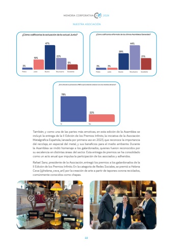 22MEMORIA CORPORATIVA 2024 NUESTRA ASOCIACI%u00d3NTambi%u00e9n, y como una de las partes m%u00e1s emotivas, en esta edici%u00f3n de la Asamblea se incluy%u00f3 la entrega de la II Edici%u00f3n de los Premios Infinito, la iniciativa de la Asociaci%u00f3n Metalgr%u00e1fica Espa%u00f1ola, lanzada por primera vez en 2023, que reconoce la importancia del reciclaje, en especial del metal, y sus beneficios para el medio ambiente. Durante la Asamblea se rindi%u00f3 homenaje a los galardonados, quienes fueron reconocidos por su excelencia en distintas %u00e1reas del sector. Esta entrega de premios se ha consolidado como un acto anual que impulsa la participaci%u00f3n de los asociados y adheridos.Rafael Sanz, presidente de la Asociaci%u00f3n, entreg%u00f3 los premios a los galardonados de la II Edici%u00f3n de los Premios Infinito. En la categor%u00eda de Redes Sociales, se premi%u00f3 a Helena Ceva (@helena_ceva_art) por la creaci%u00f3n de arte a partir de tapones corona reciclados, com%u00fanmente conocidos como chapas.