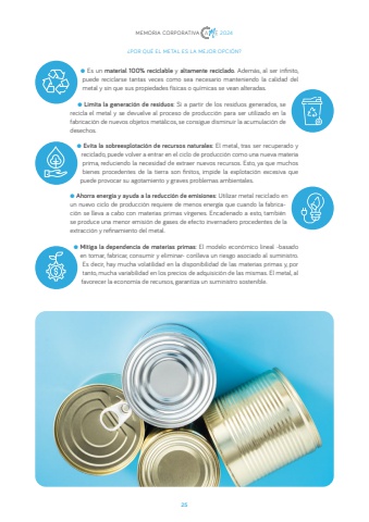 25l Es un material 100% reciclable y altamente reciclado. Adem%u00e1s, al ser infinito, puede reciclarse tantas veces como sea necesario manteniendo la calidad del metal y sin que sus propiedades f%u00edsicas o qu%u00edmicas se vean alteradas. l Limita la generaci%u00f3n de residuos: Si a partir de los residuos generados, se recicla el metal y se devuelve al proceso de producci%u00f3n para ser utilizado en la fabricaci%u00f3n de nuevos objetos met%u00e1licos, se consigue disminuir la acumulaci%u00f3n de desechos. l Evita la sobreexplotaci%u00f3n de recursos naturales: El metal, tras ser recuperado y reciclado, puede volver a entrar en el ciclo de producci%u00f3n como una nueva materia prima, reduciendo la necesidad de extraer nuevos recursos. Esto, ya que muchos bienes procedentes de la tierra son finitos, impide la explotaci%u00f3n excesiva que puede provocar su agotamiento y graves problemas ambientales. l Ahorra energ%u00eda y ayuda a la reducci%u00f3n de emisiones: Utilizar metal reciclado en un nuevo ciclo de producci%u00f3n requiere de menos energ%u00eda que cuando la fabricaci%u00f3n se lleva a cabo con materias primas v%u00edrgenes. Encadenado a esto, tambi%u00e9n se produce una menor emisi%u00f3n de gases de efecto invernadero procedentes de la extracci%u00f3n y refinamiento del metal. l Mitiga la dependencia de materias primas: El modelo econ%u00f3mico lineal -basado en tomar, fabricar, consumir y eliminar- conlleva un riesgo asociado al suministro. Es decir, hay mucha volatilidad en la disponibilidad de las materias primas y, por tanto, mucha variabilidad en los precios de adquisici%u00f3n de las mismas. El metal, al favorecer la econom%u00eda de recursos, garantiza un suministro sostenible.MEMORIA CORPORATIVA 2024%u00bfPOR QU%u00c9 EL METAL ES LA MEJOR OPCI%u00d3N?