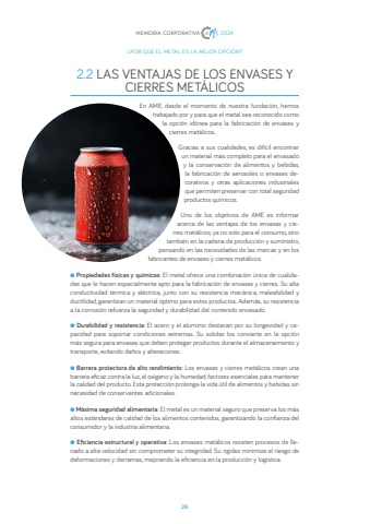 26MEMORIA CORPORATIVA 2024%u00bfPOR QU%u00c9 EL METAL ES LA MEJOR OPCI%u00d3N?2.2 LAS VENTAJAS DE LOS ENVASES Y CIERRES MET%u00c1LICOSEn AME, desde el momento de nuestra fundaci%u00f3n, hemos trabajado por y para que el metal sea reconocido como la opci%u00f3n id%u00f3nea para la fabricaci%u00f3n de envases y cierres met%u00e1licos.Gracias a sus cualidades, es dif%u00edcil encontrar un material m%u00e1s completo para el envasado y la conservaci%u00f3n de alimentos y bebidas, la fabricaci%u00f3n de aerosoles o envases decorativos y otras aplicaciones industriales que permiten preservar con total seguridad productos qu%u00edmicos. Uno de los objetivos de AME es informar acerca de las ventajas de los envases y cierres met%u00e1licos, ya no solo para el consumo, sino tambi%u00e9n en la cadena de producci%u00f3n y suministro, pensando en las necesidades de las marcas y en los fabricantes de envases y cierres met%u00e1licos. l Propiedades f%u00edsicas y qu%u00edmicas: El metal ofrece una combinaci%u00f3n %u00fanica de cualidades que le hacen especialmente apto para la fabricaci%u00f3n de envases y cierres. Su alta conductividad t%u00e9rmica y el%u00e9ctrica, junto con su resistencia mec%u00e1nica, maleabilidad y ductilidad, garantizan un material %u00f3ptimo para estos productos. Adem%u00e1s, su resistencia a la corrosi%u00f3n refuerza la seguridad y durabilidad del contenido envasado.l Durabilidad y resistencia: El acero y el aluminio destacan por su longevidad y capacidad para soportar condiciones extremas. Su solidez los convierte en la opci%u00f3n m%u00e1s segura para envases que deben proteger productos durante el almacenamiento y transporte, evitando da%u00f1os y alteraciones.l Barrera protectora de alto rendimiento: Los envases y cierres met%u00e1licos crean una barrera eficaz contra la luz, el ox%u00edgeno y la humedad, factores esenciales para mantener la calidad del producto. Esta protecci%u00f3n prolonga la vida %u00fatil de alimentos y bebidas sin necesidad de conservantes adicionales.l M%u00e1xima seguridad alimentaria: El metal es un material seguro que preserva los m%u00e1s altos est%u00e1ndares de calidad de los alimentos contenidos, garantizando la confianza del consumidor y la industria alimentaria.l Eficiencia estructural y operativa: Los envases met%u00e1licos resisten procesos de llenado a alta velocidad sin comprometer su integridad. Su rigidez minimiza el riesgo de deformaciones y derrames, mejorando la eficiencia en la producci%u00f3n y log%u00edstica.
