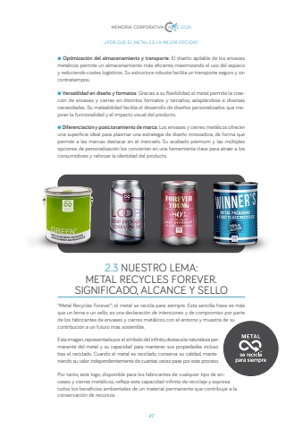 27l Optimizaci%u00f3n del almacenamiento y transporte: El dise%u00f1o apilable de los envases met%u00e1licos permite un almacenamiento m%u00e1s eficiente, maximizando el uso del espacio y reduciendo costes log%u00edsticos. Su estructura robusta facilita un transporte seguro y sin contratiempos.l Versatilidad en dise%u00f1o y formatos: Gracias a su flexibilidad, el metal permite la creaci%u00f3n de envases y cierres en distintos formatos y tama%u00f1os, adapt%u00e1ndose a diversas necesidades. Su maleabilidad facilita el desarrollo de dise%u00f1os personalizados que mejoran la funcionalidad y el impacto visual del producto.l Diferenciaci%u00f3n y posicionamiento de marca: Los envases y cierres met%u00e1licos ofrecen una superficie ideal para plasmar una estrategia de dise%u00f1o innovadora, de forma que permite a las marcas destacar en el mercado. Su acabado premium y las m%u00faltiples opciones de personalizaci%u00f3n los convierten en una herramienta clave para atraer a los consumidores y reforzar la identidad del producto.2.3 NUESTRO LEMA: METAL RECYCLES FOREVER. SIGNIFICADO, ALCANCE Y SELLO%u201cMetal Recycles Forever%u201d; el metal se recicla para siempre. Esta sencilla frase es m%u00e1s que un lema o un sello; es una declaraci%u00f3n de intenciones y de compromiso por parte de los fabricantes de envases y cierres met%u00e1licos con el entorno y muestra de su contribuci%u00f3n a un futuro m%u00e1s sostenible. Esta imagen, representada por el s%u00edmbolo del infinito, destaca la naturaleza permanente del metal y su capacidad para mantener sus propiedades incluso tras el reciclado. Cuando el metal es reciclado, conserva su calidad, manteniendo su valor independientemente de cuantas veces pase por este proceso. Por tanto, este logo, disponible para los fabricantes de cualquier tipo de envases y cierres met%u00e1licos, refleja esta capacidad infinita de reciclaje y expresa todos los beneficios ambientales de un material permanente que contribuye a la conservaci%u00f3n de recursos.MEMORIA CORPORATIVA 2024%u00bfPOR QU%u00c9 EL METAL ES LA MEJOR OPCI%u00d3N?