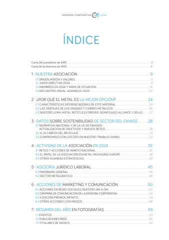 3Carta del presidente de AME.................................................................................................................................................................4 Carta de la directora de AME.................................................................................................................................................................61 %u00b7 NUESTRA ASOCIACI%u00d3N............................................................................................................................................91.1 ORIGEN, MISI%u00d3N Y VALORES.................................................................................................................................................91.2 JUNTA DIRECTIVA 2024...........................................................................................................................................................91.3 MIEMBROS EN 2024 Y MAPA DE SITUACI%u00d3N......................................................................................................10 1.4 ENCUENTRO ANUAL: ASAMBLEA 2024..................................................................................................................202 %u00b7 %u00bfPOR QU%u00c9 EL METAL ES LA MEJOR OPCI%u00d3N?..............................................................242.1 CARACTER%u00cdSTICAS DIFERENCIADORAS DE ESTE MATERIAL................................................................ 24 2.2 LAS VENTAJAS DE LOS ENVASES Y CIERRES MET%u00c1LICOS.....................................................................262.3 NUESTRO LEMA: METAL RECYCLES FOREVER. SIGNIFICADO, ALCANCE Y SELLO.............273 %u00b7 DATOS SOBRE SOSTENIBILIDAD DE SECTOR DEL ENVASE....................283.1 NORMATIVA NACIONAL Y DE LA UE DE ENVASES: ACTUALIZACI%u00d3N DE OBJETIVOS Y NUEVOS RETOS....................................................................................283.2 A LA CABEZA DEL RECICLAJE.........................................................................................................................................313.3 COMPROMISO CON LOS ODS EN NUESTRO TRABAJO DIARIO........................................................324 %u00b7 ACTIVIDAD DE LA ASOCIACI%u00d3N EN 2024............................................................................354.1 RETOS Y ACCIONES DE %u00c1MBITO NACIONAL......................................................................................................354.2 EL PAPEL DE LA ASOCIACI%u00d3N EN METAL PACKAGING EUROPE .....................................................384.3 OTRAS ALIANZAS ESTRAT%u00c9GICAS.............................................................................................................................435 %u00b7 ASESOR%u00cdA JUR%u00cdDICO LABORAL.............................................................................................................455.1 PANORAMA GENERAL ...........................................................................................................................................................455.2 SECTOR METALGR%u00c1FICO...................................................................................................................................................486 %u00b7 ACCIONES DE MARKETING Y COMUNICACI%u00d3N........................................................506.1 ACCIONES EN REDES SOCIALES: NUESTRO D%u00cdA A D%u00cdA..............................................................................506.2 CAMPA%u00d1A DE COMUNICACI%u00d3N DE LA MEMORIA CORPORATIVA.............................................................526.3 II EDICI%u00d3N PREMIOS INFINITO........................................................................................................................................546.4 OTRAS ACCIONES CON MEDIOS................................................................................................................................587 %u00b7 RESUMEN DEL A%u00d1O EN FOTOGRAF%u00cdAS...................................................................................597.1 EVENTOS...........................................................................................................................................................................................597.2 PUBLICACIONES RRSS..............................................................................................................................................................607.3 TITULARES DE MEDIOS........................................................................................................................................................62%u00cdNDICEMEMORIA CORPORATIVA 2024