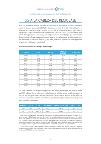 313.2 A LA CABEZA DEL RECICLAJE A%u00fan a la espera de obtener los datos actualizados de reciclaje de 2024, es necesario volver a recalcar que desde 2020, los Estados miembro de la UE est%u00e1n obligados a efectuar un doble reporte de los datos: uno conforme se ven%u00eda haciendo seg%u00fan la antigua metodolog%u00eda de c%u00e1lculo, que contabilizaba como reciclado todo el material a la salida de la planta de selecci%u00f3n, y otro seg%u00fan la nueva metodolog%u00eda que establece la Directiva de la UE que, m%u00e1s estricta que la anterior, mide la tasa de reciclaje tras la %u00faltima operaci%u00f3n de reciclado efectivo (y, por tanto, resta todo aquello que sean impropios o la simple valorizaci%u00f3n energ%u00e9tica). Hist%u00f3rico conforme a la antigua metodolog%u00eda:De cara a ofrecer una mayor transparencia del sector, se recogen los datos a partir de 2021 solo conforme a la nueva metodolog%u00eda de c%u00e1lculo -y que ser%u00e1 la que opere a De DATOS SOBRE SOSTENIBILIDAD DEL SECTOR DEL ENVASEMEMORIA CORPORATIVA 2024ESPA%u00d1A TOTAL METAL PAPEL Y CART%u00d3N PL%u00c1STICO2009 61,5 71,3 84,2 41,92010 65,9 71,5 83 45,32011 68,3 77 82 53,62012 70,3 81,6 81,9 53,62013 71,9 84,5 81,5 56,62014 73,7 83,6 81,7 61,42015 74,8 83 82,9 63,82016 76 84,8 82,3 66,52017 77,1 86,9 81,1 69,72018 78,8 85,4 80 75,82019 80,2 83,1 81 79,52020 80,7 86,9 78,9 81,12021 82,8 86,4 78,2 87,3De cara a ofrecer una mayor transparencia del sector, se recogen los datos a partir de 2021 solo conforme a la nueva metodolog%u00eda de c%u00e1lculo -y que ser%u00e1 la que opere a futuro-, ya distinguiendo entre acero y aluminio. De esta forma, a partir de ese a%u00f1o con el nuevo sistema de reporte, encontramos que bajan los porcentajes de reciclaje real para todos los materiales.ESPA%u00d1A TOTAL ACERO ALUMINIO PAPEL Y CART%u00d3N PL%u00c1STICO2022 74% 101%* 50,2%** 79,5% 69,3%2023 74,2% 104,9%* 51,2%** 78,4% 70,3%* Nota: % tasa reciclado mide toneladas recicladas sobre toneladas puestas en el mercado. En acero, los % por encima del 100% (lo que sucede en la mayor%u00eda de lo explicado b%u00e1sicamente por 2 razones: (1) fraude: aunque en metales no hay mucho, algo habr%u00eda, en la medida en que los envasadores est%u00e9n declarando menos toneladas puestas en el mercado de las que realmente ponen, algo que en un material tan reciclado como el acero puede hacer subir el % por encima de 100) y que seg%u00fan se estima podr%u00eda estar entre el 3 y el 5%; (2) puede que haya en ese dato algo de acero recuperado que no sea envase como tal.** Dato calculado de reciclaje de envase met%u00e1lico de bebidas (obviando por tanto la menor reciclabilidad de aluminios no r%u00edgidos: aluminio flexible y aluminio en multicapas como el brick, que tambi%u00e9n penaliza la tasa) es del 76,1% (%u00faltimo dato disponible).
