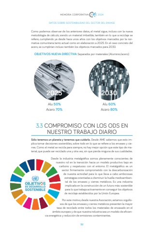 32MEMORIA CORPORATIVA 2024DATOS SOBRE SOSTENIBILIDAD DEL SECTOR DEL ENVASEComo podemos observar de los anteriores datos, el metal sigue, incluso con la nueva metodolog%u00eda de c%u00e1lculo, siendo un material imbatible, tambi%u00e9n en lo que a reciclaje se refiere, cumpliendo ya desde hace unos a%u00f1os con los objetivos marcados por la normativa comunitaria tanto actual como en elaboraci%u00f3n a 2025. En el caso concreto del acero, se cumplir%u00edan incluso tambi%u00e9n los objetivos marcados para 2030.2025Alu 50%Acero 70%2030Alu 60%Acero 80%OBJETIVOS NUEVA DIRECTIVA Separados por materiales (Aluminio/acero):3.3 COMPROMISO CON LOS ODS EN NUESTRO TRABAJO DIARIO S%u00f3lo tenemos un planeta y tenemos que cuidarlo. Desde AME sabemos que esto implica tomar decisiones sostenibles, sobre todo en lo que se refiere a los envases y cierres. Como el metal se recicla para siempre, no hay mejor opci%u00f3n que este tipo de material, que puede ser reciclado una y otra vez, sin que pierda ninguna de sus cualidades.Desde la industria metalgr%u00e1fica somos plenamente conscientes de nuestro rol en la transici%u00f3n hacia un modelo productivo bajo en carbono y respetuoso con el entorno. El metalgr%u00e1fico es un sector firmemente comprometido con la descarbonizaci%u00f3n de nuestra actividad para lo que lleva a cabo ambiciosas estrategias orientadas a disminuir la huella medioambiental de los envases y cierres met%u00e1licos. Es una industria implicada en la construcci%u00f3n de un futuro m%u00e1s sostenible para lo que trabaja activamente en conseguir los objetivos de reciclaje establecidos por la Uni%u00f3n Europea.Por este motivo, desde nuestra Asociaci%u00f3n, estamos orgullosos de que los envases y cierres met%u00e1licos presenten la mayor tasa de reciclado entre todos los materiales de envasado en el %u00e1mbito europeo y de que nuestra industria sea un modelo de eficiencia energ%u00e9tica y reducci%u00f3n de emisiones contaminantes.