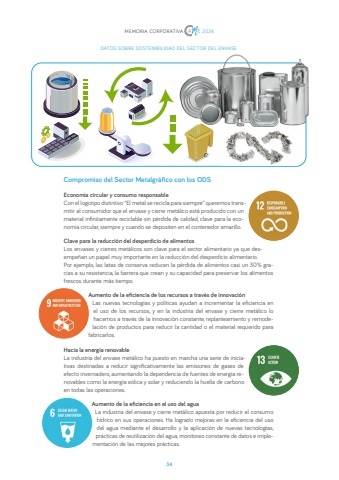 34MEMORIA CORPORATIVA 2024DATOS SOBRE SOSTENIBILIDAD DEL SECTOR DEL ENVASECompromiso del Sector Metalgr%u00e1fico con los ODSEconom%u00eda circular y consumo responsableCon el logotipo distintivo %u201cEl metal se recicla para siempre%u201d queremos transmitir al consumidor que el envase y cierre met%u00e1lico est%u00e1 producido con un material infinitamente reciclable sin p%u00e9rdida de calidad, clave para la econom%u00eda circular, siempre y cuando se depositen en el contenedor amarillo. Clave para la reducci%u00f3n del desperdicio de alimentosLos envases y cierres met%u00e1licos son clave para el sector alimentario ya que desempe%u00f1an un papel muy importante en la reducci%u00f3n del desperdicio alimentario. Por ejemplo, las latas de conserva reducen la p%u00e9rdida de alimentos casi un 30% gracias a su resistencia, la barrera que crean y su capacidad para preservar los alimentos frescos durante m%u00e1s tiempo. Aumento de la eficiencia de los recursos a trav%u00e9s de innovaci%u00f3nLas nuevas tecnolog%u00edas y pol%u00edticas ayudan a incrementar la eficiencia en el uso de los recursos, y en la industria del envase y cierre met%u00e1lico lo hacemos a trav%u00e9s de la innovaci%u00f3n constante, replanteamiento y remodelaci%u00f3n de productos para reducir la cantidad o el material requerido para fabricarlos.Hacia la energ%u00eda renovableLa industria del envase met%u00e1lico ha puesto en marcha una serie de iniciativas destinadas a reducir significativamente las emisiones de gases de efecto invernadero, aumentando la dependencia de fuentes de energ%u00eda renovables como la energ%u00eda e%u00f3lica y solar y reduciendo la huella de carbono en todas las operaciones.Aumento de la eficiencia en el uso del aguaLa industria del envase y cierre met%u00e1lico apuesta por reducir el consumo h%u00eddrico en sus operaciones. Ha logrado mejoras en la eficiencia del uso del agua mediante el desarrollo y la aplicaci%u00f3n de nuevas tecnolog%u00edas, pr%u00e1cticas de reutilizaci%u00f3n del agua, monitoreo constante de datos e implementaci%u00f3n de las mejores pr%u00e1cticas.