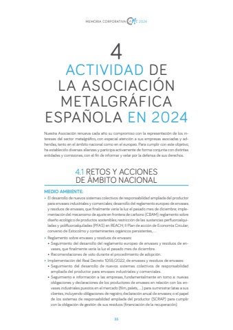35Nuestra Asociaci%u00f3n renueva cada a%u00f1o su compromiso con la representaci%u00f3n de los intereses del sector metalgr%u00e1fico, con especial atenci%u00f3n a sus empresas asociadas y adheridas, tanto en el %u00e1mbito nacional como en el europeo. Para cumplir con este objetivo, ha establecido diversas alianzas y participa activamente de forma conjunta con distintas entidades y comisiones, con el fin de informar y velar por la defensa de sus derechos.4.1 RETOS Y ACCIONES DE %u00c1MBITO NACIONAL MEDIO AMBIENTE:%u2022 El desarrollo de nuevos sistemas colectivos de responsabilidad ampliada del productor para envases industriales y comerciales; desarrollo del reglamento europeo de envases y residuos de envases, que finalmente ver%u00eda la luz el pasado mes de diciembre; implementaci%u00f3n del mecanismo de ajuste en frontera de carbono (CBAM); reglamento sobre dise%u00f1o ecol%u00f3gico de productos sostenibles; restricci%u00f3n de las sustancias perfluoroalquiladas y polifluoroalquiladas (PFAS) en REACH; II Plan de acci%u00f3n de Econom%u00eda Circular; convenio de Estocolmo y contaminantes org%u00e1nicos persistentes, %u2026%u2022 Reglamento sobre envases y residuos de envases:%u2022 Seguimiento del desarrollo del reglamento europeo de envases y residuos de envases, que finalmente ver%u00eda la luz el pasado mes de diciembre.%u2022 Recomendaciones de voto durante el procedimiento de adopci%u00f3n.%u2022 Implementaci%u00f3n del Real Decreto 1055/2022, de envases y residuos de envases:%u2022 Seguimiento del desarrollo de nuevos sistemas colectivos de responsabilidad ampliada del productor para envases industriales y comerciales. %u2022 Seguimiento e informaci%u00f3n a las empresas, fundamentalmente en torno a: nuevas obligaciones y declaraciones de los productores de envases en relaci%u00f3n con los envases industriales puestos en el mercado (film, palets, ...) para suministrar latas a sus clientes, incluyendo obligaciones de registro, declaraci%u00f3n anual de envases; o el papel de los sistemas de responsabilidad ampliada del productor (SCRAP) para cumplir con la obligaci%u00f3n de gesti%u00f3n de sus residuos (financiaci%u00f3n de la recuperaci%u00f3n).4ACTIVIDAD DE LA ASOCIACI%u00d3N METALGR%u00c1FICA ESPA%u00d1OLA EN 2024MEMORIA CORPORATIVA 2024