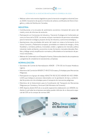 37MEMORIA CORPORATIVA 2024ACTIVIDAD DE LA ASOCIACI%u00d3N METALGR%u00c1FICA ESPA%u00d1OLA EN 2024%u2022 Webinar sobre instrumentos legislativos para la transici%u00f3n energ%u00e9tica industrial (marzo 2024): mecanismo de ajuste en frontera de carbono; certificados de Ahorro Energ%u00e9tico; y redes de Distribuci%u00f3n Cerradas.INDUSTRIA:%u2022 Contribuciones a la encuesta de sentimiento econ%u00f3mico trimestral del sector del metal y env%u00edo de informes de evoluci%u00f3n. %u2022 Participaci%u00f3n en Comisiones de Industria y Transici%u00f3n Ecol%u00f3gica de Confemetal, as%u00ed como en foros de la CEOE. Los temas incluyen: tramitaci%u00f3n de permisos industriales para la transici%u00f3n ecol%u00f3gica, proyecto de ley de industria y autonom%u00eda estrat%u00e9gica, ...%u2022 Aportaciones a las prioridades del sector del metal con vistas a la formaci%u00f3n de la nueva Comisi%u00f3n y Parlamento europeos: prioridades en materia de energ%u00eda y clima, fiscalidad y contratos p%u00fablicos, morosidad, unidad y vigilancia de mercado, pol%u00edtica industrial, medio ambiente y econom%u00eda circular, formaci%u00f3n, mercados laborales flexibles y di%u00e1logo social, simplificaci%u00f3n normativa y dificultades en la tramitaci%u00f3n de permisos industriales, ...%u2022 Webinar de Confemetal con el Despacho Huerta y Solana sobre derecho de competencia y programas de compliance en asociaciones y empresas.NORMALIZACI%u00d3N:%u2022 Secretar%u00eda del Comit%u00e9 de Normalizaci%u00f3n AENOR - CTN-125 de Envases Met%u00e1licos Ligeros.%u2022 Miembros del Comit%u00e9 de AENOR CT-49 GT/4, Envases y Embalajes para Mercanc%u00edas Peligrosas.%u2022 Participaci%u00f3n en el grupo de trabajo AEN/CTN 192 SC/03 AENOR AD HOC EMBALAJES, que trabaja en procesos relacionados con la aprobaci%u00f3n de tipo y conformidad de producci%u00f3n de embalajes para el transporte de mercanc%u00edas peligrosas.%u2022 Miembros de la Subcomisi%u00f3n para la Coordinaci%u00f3n del Transporte de Mercanc%u00edas Peligrosas por Carretera y Ferrocarril (del Ministerio de Fomento).%u2022 AME dispone, desde 2021, de un acuerdo especial de colaboraci%u00f3n con AENOR, mediante el cual todas las empresas asociadas pueden disfrutar de un descuento especial del 20% en la compra de normas UNE.