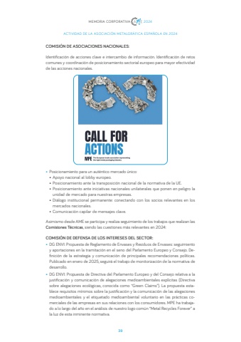 39MEMORIA CORPORATIVA 2024ACTIVIDAD DE LA ASOCIACI%u00d3N METALGR%u00c1FICA ESPA%u00d1OLA EN 2024COMISI%u00d3N DE ASOCIACIONES NACIONALES:Identificaci%u00f3n de acciones clave e intercambio de informaci%u00f3n. Identificaci%u00f3n de retos comunes y coordinaci%u00f3n de posicionamiento sectorial europeo para mayor efectividad de las acciones nacionales.%u2022 Posicionamiento para un aut%u00e9ntico mercado %u00fanico:%u2022 Apoyo nacional al lobby europeo.%u2022 Posicionamiento ante la transposici%u00f3n nacional de la normativa de la UE.%u2022 Posicionamiento ante iniciativas nacionales unilaterales que ponen en peligro la unidad de mercado para nuestras empresas.%u2022 Di%u00e1logo institucional permanente: conectando con los socios relevantes en los mercados nacionales.%u2022 Comunicaci%u00f3n capilar de mensajes clave.Asimismo desde AME se participa y realiza seguimiento de los trabajos que realizan las Comisiones T%u00e9cnicas, siendo las cuestiones m%u00e1s relevantes en 2024:COMISI%u00d3N DE DEFENSA DE LOS INTERESES DEL SECTOR:%u2022 DG ENVI: Propuesta de Reglamento de Envases y Residuos de Envases: seguimiento y aportaciones en la tramitaci%u00f3n en el seno del Parlamento Europeo y Consejo. Definici%u00f3n de la estrategia y comunicaci%u00f3n de principales recomendaciones pol%u00edticas. Publicado en enero de 2025, seguir%u00e1 el trabajo de monitorizaci%u00f3n de la normativa de desarrollo.%u2022 DG ENVI: Propuesta de Directiva del Parlamento Europeo y del Consejo relativa a la justificaci%u00f3n y comunicaci%u00f3n de alegaciones medioambientales expl%u00edcitas (Directiva sobre alegaciones ecol%u00f3gicas, conocida como %u201cGreen Claims%u201d). La propuesta establece requisitos m%u00ednimos sobre la justificaci%u00f3n y la comunicaci%u00f3n de las alegaciones medioambientales y el etiquetado medioambiental voluntario en las pr%u00e1cticas comerciales de las empresas en sus relaciones con los consumidores. MPE ha trabajado a lo largo del a%u00f1o en el an%u00e1lisis de nuestro logo com%u00fan %u201cMetal Recycles Forever%u201d a la luz de esta inminente normativa.