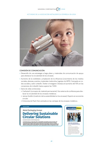 41MEMORIA CORPORATIVA 2024ACTIVIDAD DE LA ASOCIACI%u00d3N METALGR%u00c1FICA ESPA%u00d1OLA EN 2024COMISI%u00d3N DE COMUNICACI%u00d3N:%u2022 Desarrollo de una estrategia a largo plazo y materiales de comunicaci%u00f3n de apoyo para destacar la circularidad de los envases.%u2022 Aumento de la visibilidad y ampliaci%u00f3n de la influencia (crecimiento de los medios sociales, alianzas, eventos, materiales traducidos, logotipo de MPE). Campa%u00f1a en redes sociales y web: LinkedIn, Twitter e Instagram. Destaca el aumento del 15% en las conexiones de LinkedIn hasta superar las 7.400.%u2022 Serie de v%u00eddeo-entrevistas:%u2022 Carbotech (concepto de material permanente): Voz externa de confianza para destacar la circularidad de los envases met%u00e1licos.%u2022 James Goddin (medici%u00f3n de la sostenibilidad en los envases): Experto en econom%u00eda circular.%u2022 Entrevista de Pack Hub centrada en las ventajas de los envases met%u00e1licos.