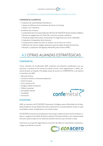 43MEMORIA CORPORATIVA 2024ACTIVIDAD DE LA ASOCIACI%u00d3N METALGR%u00c1FICA ESPA%u00d1OLA EN 2024COMISI%u00d3N DE ALIMENTOS:%u2022 Proyectos de sostenibilidad orientados a:%u2022 Apoyar la defensa de los intereses del sector en Europa.%u2022 Apoyo a los miembros.%u2022 Iniciativas que incluyen:%u2022 Lanzamiento de una nueva Evaluaci%u00f3n del Ciclo de Vida (ECV) de los envases met%u00e1licos.%u2022 Revisar las alegaciones de Tetra Pak contra los envases met%u00e1licos.%u2022 Presentar argumentos para contrarrestar los esgrimidos por otros materiales.%u2022 Evaluaci%u00f3n comparativa de la industria.%u2022 Enfoque de la cadena de valor en relaci%u00f3n con el acero sin cromo.%u2022 Definici%u00f3n de nuevos c%u00f3digos aduaneros para las tapas de latas de aluminio.%u2022 Revisi%u00f3n y evaluaci%u00f3n del logotipo Metal Recycles Forever (MRF).4.3 OTRAS ALIANZAS ESTRAT%u00c9GICAS:CONFEMETAL:Como miembro de Confemetal, AME mantiene una estrecha coordinaci%u00f3n con sus servicios y contacto en los temas de inter%u00e9s com%u00fan como organizaci%u00f3n y %u201clobby%u201d patronal de peso en Espa%u00f1a. Principales %u00e1reas de acci%u00f3n en CONFEMETAL y de reporte a miembros de AME:%u2022 Mercado Interior%u2022 Comercio Exterior e Internacionalizaci%u00f3n%u2022 Uni%u00f3n Europea%u2022 I+D e Industria 4.0%u2022 Energ%u00eda y Medio Ambiente%u2022 Pol%u00edtica Industrial%u2022 Actualidad Laboral%u2022 Fiscalidad%u2022 Formaci%u00f3nECOACERO:AME es miembro de ECOACERO (Asociaci%u00f3n Ecol%u00f3gica para el Reciclado de la Hojalata), entidad en la que desde hace a%u00f1os mantenemos una participaci%u00f3n activa y cuyas actividades se han multiplicado en los %u00faltimos a%u00f1os.ECOACERO promueve la recuperaci%u00f3n de envases usados de acero de los residuos urbanos y asegura el reciclado de dichos residuos. Participa tambi%u00e9n como representante del acero para envases en los distintos estudios t%u00e9cnicos que se llevan a cabo. Asimismo, se ocupa del seguimiento y la acci%u00f3n de lobby en importantes cuestiones y riesgos que afectan al sector.