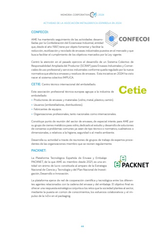 44MEMORIA CORPORATIVA 2024ACTIVIDAD DE LA ASOCIACI%u00d3N METALGR%u00c1FICA ESPA%u00d1OLA EN 2024CONFECOI:AME ha mantenido seguimiento de las actividades desarrolladas por la Confederaci%u00f3n del Ecoenvase Industrial, entidad que, desde el a%u00f1o 1997, tiene por objeto fomentar y facilitar la reducci%u00f3n, reutilizaci%u00f3n y reciclado de envases industriales puestos en el mercado y que busca facilitar el cumplimiento de los objetivos marcados por la Ley vigente.Centr%u00f3 la atenci%u00f3n en el pasado ejercicio el desarrollo de un Sistema Colectivo de Responsabilidad Ampliada del Productor (SCRAP) para Envases Industriales y Comerciales de uso profesional y servicios industriales conforme queda regulado por la nueva normativa que afecta a envases y residuos de envases. Esta iniciativa en 2024 ha visto nacer el sistema colectivo IMPLICA. CETIE: Centro t%u00e9cnico internacional del embotellado.Esta asociaci%u00f3n profesional t%u00e9cnica europea agrupa a la industria de embotellado:%u2022 Productores de envases y materiales (vidrio, metal, pl%u00e1stico, cart%u00f3n).%u2022 Usuarios (embotelladores, distribuidores).%u2022 Fabricantes de equipos.%u2022 Organizaciones profesionales, tanto nacionales como internacionales.Constituye punto de reuni%u00f3n del sector de envases, de especial inter%u00e9s para AME por su grupo de cierres met%u00e1licos para vidrio, dedicado al estudio y desarrollo de soluciones de consenso a problemas comunes ya sean de tipo t%u00e9cnico o normativo, cualitativos o dimensionales, o relativos a la higiene, seguridad o al medio ambiente.Desarrolla su actividad a trav%u00e9s de reuniones de grupos de trabajo de expertos procedentes de las organizaciones miembro que se re%u00fanen regularmente.PACKNET:La Plataforma Tecnol%u00f3gica Espa%u00f1ola de Envase y Embalaje PACKNET, de la que AME es miembro desde 2021, es una entidad sin %u00e1nimo de lucro constituida al amparo de la Estrategia Nacional de Ciencia y Tecnolog%u00eda y del Plan Nacional de Investigaci%u00f3n, Desarrollo e Innovaci%u00f3n.La plataforma ejerce de red de cooperaci%u00f3n cient%u00edfica y tecnol%u00f3gica entre los diferentes agentes relacionados con la cadena del envase y del embalaje. El objetivo final es ofrecer una respuesta estrat%u00e9gica conjunta a los retos que la sociedad plantea al sector, mediante la puesta en com%u00fan de conocimientos, los esfuerzos colaborativos y el impulso de la I+D+i en el packaging.