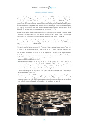 49ASESOR%u00cdA JUR%u00cdDICO LABORALa la actualizaci%u00f3n y cierre de las tablas salariales de 2023 con el porcentaje del 7,44 %, la posici%u00f3n de AME siguiendo la interpretaci%u00f3n literal del citado art. 18, era que la aplicaci%u00f3n del 7,44% deb%u00eda llevarse a cabo en las tablas del 2024. Para ello, en primer lugar deber%u00eda realizarse la constituci%u00f3n de la Comisi%u00f3n Negociadora del nuevo Convenio Colectivo, para que una vez se hubiese pactado el incremento salarial para 2024, se le sumase al mismo el porcentaje correspondiente a la desviaci%u00f3n de la Cl%u00e1usula de revisi%u00f3n del Convenio anterior, esto es: el 7,44%. Ante el desacuerdo, los sindicatos instaron procedimiento de mediaci%u00f3n en el SIMA y posterior demanda de conflicto colectivo ante la Audiencia Nacional. Conflicto que fue resuelto en Sentencia estimatoria de la tesis sindical, el d%u00eda 15-04-24.Conocido el fallo, desde AME se inst%u00f3 a las empresas del sector a que procedieran a abonar dicha desviaci%u00f3n salarial, public%u00e1ndose las tablas definitivas de 2023 en el BOE, con efectos desde el 1-01-2024. El 1 de julio de 2024 se constituy%u00f3 la Comisi%u00f3n Negociadora del Convenio Colectivo. La parte social, est%u00e1 formada por 15 personas (6 de CC. OO, 5 de UGT y 4 de USO).Tras diversas reuniones en 2024 y 2025, el pasado 7 de mayo las organizaciones sindicales y empresariales del sector alcanzaron un preacuerdo de Convenio Colectivo Estatal que contiene, entre otros, los siguientes puntos:%u2022 Vigencia: 2024, 2025, 2026, 2027.%u2022 Incrementos salariales. 2024: 3%; 2025: 3%; 2026: 3,5% y 2027: 3%. Cl%u00e1usula de revisi%u00f3n salarial para los 4 a%u00f1os, la del V AENC: Si el IPC anual es mayor al incremento pactado cada a%u00f1o se revisa con el tope del 1% sin efecto retroactivo, como base de c%u00e1lculo de las tablas salariales del a%u00f1o siguiente.%u2022 Distribuci%u00f3n irregular de la jornada, 140 horas con preaviso de 5 d%u00edas a los trabajadores afectados y a la RLT.%u2022 Complemento de IT: En 2026 en el supuesto de contingencias comunes sin hospitalizaci%u00f3n, se complementan las primeras 4 bajas, desde el d%u00eda 12, por un periodo m%u00e1ximo de 6 meses al a%u00f1o, y a partir de 2027 se abona dicho complemento con las mismas condiciones en las 3 primeras bajas de enfermedad o de accidente no laboral.MEMORIA CORPORATIVA 2024