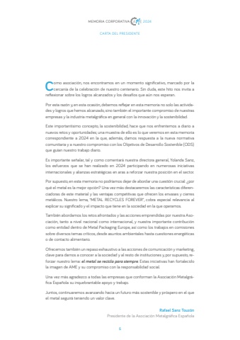5Como asociaci%u00f3n, nos encontramos en un momento significativo, marcado por la cercan%u00eda de la celebraci%u00f3n de nuestro centenario. Sin duda, este hito nos invita a reflexionar sobre los logros alcanzados y los desaf%u00edos que a%u00fan nos esperan.Por esta raz%u00f3n y, en esta ocasi%u00f3n, debemos reflejar en esta memoria no solo las actividades y logros que hemos alcanzado, sino tambi%u00e9n el importante compromiso de nuestras empresas y la industria metalgr%u00e1fica en general con la innovaci%u00f3n y la sostenibilidad.Este important%u00edsimo concepto, la sostenibilidad, hace que nos enfrentemos a diario a nuevos retos y oportunidades; una muestra de ello es lo que veremos en esta memoria correspondiente a 2024 en la que, adem%u00e1s, damos respuesta a la nueva normativa comunitaria y a nuestro compromiso con los Objetivos de Desarrollo Sostenible (ODS) que gu%u00edan nuestro trabajo diario. Es importante se%u00f1alar, tal y como comentar%u00e1 nuestra directora general, Yolanda Sanz, los esfuerzos que se han realizado en 2024 participando en numerosas iniciativas internacionales y alianzas estrat%u00e9gicas en aras a reforzar nuestra posici%u00f3n en el sector. Por supuesto, en esta memoria no podr%u00edamos dejar de abordar una cuesti%u00f3n crucial: %u00bfpor qu%u00e9 el metal es la mejor opci%u00f3n? Una vez m%u00e1s destacaremos las caracter%u00edsticas diferenciadoras de este material y las ventajas competitivas que ofrecen los envases y cierres met%u00e1licos. Nuestro lema, %u201cMETAL RECYCLES FOREVER%u201d, cobra especial relevancia al explicar su significado y el impacto que tiene en la sociedad en la que operamos.Tambi%u00e9n abordamos los retos afrontados y las acciones emprendidas por nuestra Asociaci%u00f3n, tanto a nivel nacional como internacional, y nuestra importante contribuci%u00f3n como entidad dentro de Metal Packaging Europe, as%u00ed como los trabajos en comisiones sobre diversos temas cr%u00edticos, desde asuntos ambientales hasta cuestiones energ%u00e9ticas o de contacto alimentario.Ofrecemos tambi%u00e9n un repaso exhaustivo a las acciones de comunicaci%u00f3n y marketing, clave para darnos a conocer a la sociedad y al resto de instituciones y, por supuesto, reforzar nuestro lema: el metal se recicla para siempre. Estas iniciativas han fortalecido la imagen de AME y su compromiso con la responsabilidad social.Una vez m%u00e1s agradezco a todas las empresas que conforman la Asociaci%u00f3n Metalgr%u00e1fica Espa%u00f1ola su inquebrantable apoyo y trabajo. Juntos, continuaremos avanzando hacia un futuro m%u00e1s sostenible y pr%u00f3spero en el que el metal seguir%u00e1 teniendo un valor clave.Rafael Sanz Touz%u00f3nPresidente de la Asociaci%u00f3n Metalgr%u00e1fica Espa%u00f1olaMEMORIA CORPORATIVA 2024CARTA DEL PRESIDENTE