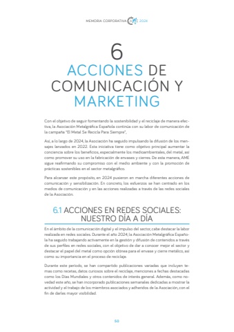 50MEMORIA CORPORATIVA 2024Con el objetivo de seguir fomentando la sostenibilidad y el reciclaje de manera efectiva, la Asociaci%u00f3n Metalgr%u00e1fica Espa%u00f1ola contin%u00faa con su labor de comunicaci%u00f3n de la campa%u00f1a %u201cEl Metal Se Recicla Para Siempre%u201d,As%u00ed, a lo largo de 2024, la Asociaci%u00f3n ha seguido impulsando la difusi%u00f3n de los mensajes lanzados en 2022. Esta iniciativa tiene como objetivo principal aumentar la conciencia sobre los beneficios, especialmente los medioambientales, del metal, as%u00ed como promover su uso en la fabricaci%u00f3n de envases y cierres. De esta manera, AME sigue reafirmando su compromiso con el medio ambiente y con la promoci%u00f3n de pr%u00e1cticas sostenibles en el sector metalgr%u00e1fico.Para alcanzar este prop%u00f3sito, en 2024 pusieron en marcha diferentes acciones de comunicaci%u00f3n y sensibilizaci%u00f3n. En concreto, los esfuerzos se han centrado en los medios de comunicaci%u00f3n y en las acciones realizadas a trav%u00e9s de las redes sociales de la Asociaci%u00f3n.6.1 ACCIONES EN REDES SOCIALES: NUESTRO D%u00cdA A D%u00cdAEn el %u00e1mbito de la comunicaci%u00f3n digital y el impulso del sector, cabe destacar la labor realizada en redes sociales. Durante el a%u00f1o 2024, la Asociaci%u00f3n Metalgr%u00e1fica Espa%u00f1ola ha seguido trabajando activamente en la gesti%u00f3n y difusi%u00f3n de contenidos a trav%u00e9s de sus perfiles en redes sociales, con el objetivo de dar a conocer mejor el sector y destacar el papel del metal como opci%u00f3n id%u00f3nea para el envase y cierre met%u00e1lico, as%u00ed como su importancia en el proceso de reciclaje.Durante este per%u00edodo, se han compartido publicaciones variadas que incluyen temas como recetas, datos curiosos sobre el reciclaje, menciones a fechas destacadas como los D%u00edas Mundiales y otros contenidos de inter%u00e9s general. Adem%u00e1s, como novedad este a%u00f1o, se han incorporado publicaciones semanales dedicadas a mostrar la actividad y el trabajo de los miembros asociados y adheridos de la Asociaci%u00f3n, con el fin de darles mayor visibilidad.6ACCIONES DE COMUNICACI%u00d3N YMARKETING