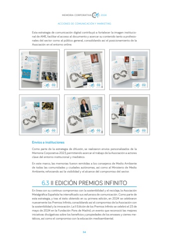 54MEMORIA CORPORATIVA 2024ACCIONES DE COMUNICACI%u00d3N Y MARKETINGEsta estrategia de comunicaci%u00f3n digital contribuy%u00f3 a fortalecer la imagen institucional de AME, facilitar el acceso al documento y acercar su contenido tanto a profesionales del sector como al p%u00fablico general, consolidando as%u00ed el posicionamiento de la Asociaci%u00f3n en el entorno online.Env%u00edos a instituciones Como parte de la estrategia de difusi%u00f3n, se realizaron env%u00edos personalizados de la Memoria Corporativa 2023, permitiendo acercar el trabajo de la Asociaci%u00f3n a actores clave del entorno institucional y medi%u00e1tico.En este marco, las memorias fueron remitidas a los consejeros de Medio Ambiente de todas las comunidades y ciudades aut%u00f3nomas, as%u00ed como al Ministerio de Medio Ambiente, reforzando as%u00ed la visibilidad y el alcance del compromiso del sector.6.3 II EDICI%u00d3N PREMIOS INFINITOEn l%u00ednea con su continuo compromiso con la sostenibilidad y el reciclaje, la Asociaci%u00f3n Metalgr%u00e1fica Espa%u00f1ola ha intensificado sus esfuerzos de comunicaci%u00f3n. Como parte de esta estrategia, y tras el %u00e9xito obtenido en su primera edici%u00f3n, en 2024 se celebraron nuevamente los Premios Infinito, consolidando as%u00ed el compromiso de la Asociaci%u00f3n con la sostenibilidad y la innovaci%u00f3n. La II Edici%u00f3n de los Premios Infinito se celebr%u00f3 el 23 de mayo de 2024 en la Fundaci%u00f3n Pons de Madrid, un evento que reconoci%u00f3 las mejores iniciativas divulgativas sobre los beneficios y propiedades de los envases y cierres met%u00e1licos, as%u00ed como el compromiso con la educaci%u00f3n medioambiental.
