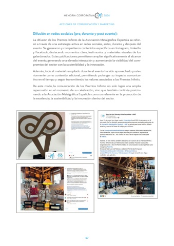 57ACCIONES DE COMUNICACI%u00d3N Y MARKETINGDifusi%u00f3n en redes sociales (pre, durante y post evento):La difusi%u00f3n de los Premios Infinito de la Asociaci%u00f3n Metalgr%u00e1fica Espa%u00f1ola se reforz%u00f3 a trav%u00e9s de una estrategia activa en redes sociales, antes, durante y despu%u00e9s del evento. Se generaron y compartieron contenidos espec%u00edficos en Instagram, LinkedIn y Facebook, destacando momentos clave, testimonios y materiales visuales de los galardonados. Estas publicaciones permitieron ampliar significativamente el alcance del evento, generando una elevada interacci%u00f3n y aumentando la visibilidad del compromiso del sector con la sostenibilidad y la innovaci%u00f3n.Adem%u00e1s, todo el material recopilado durante el evento ha sido aprovechado posteriormente como contenido adicional, permitiendo prolongar su impacto comunicativo en el tiempo y seguir transmitiendo los valores asociados a los Premios Infinito.De este modo, la comunicaci%u00f3n de los Premios Infinito no solo logr%u00f3 una amplia repercusi%u00f3n en el momento de su celebraci%u00f3n, sino que tambi%u00e9n contin%u00faa posicionando a la Asociaci%u00f3n Metalgr%u00e1fica Espa%u00f1ola como un referente en la promoci%u00f3n de la excelencia, la sostenibilidad y la innovaci%u00f3n dentro del sector. MEMORIA CORPORATIVA 2024