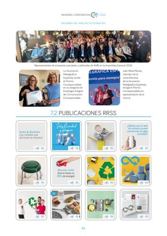 60MEMORIA CORPORATIVA 2024RESUMEN DEL A%u00d1O EN FOTOGRAF%u00cdASLa Asociaci%u00f3n Metalgr%u00e1fica Espa%u00f1ola recibe el Premio Corresponsables en la categor%u00eda de Estrategia Integral de Comunicaci%u00f3n Corresponsable.Jose Mar%u00eda Planas, miembro de la Junta Directiva de la Asociaci%u00f3n Metalgr%u00e1fica Espa%u00f1ola, recoge el Premio Corresponsables en representaci%u00f3n de la misma.7.2 PUBLICACIONES RRSSRepresentantes de empresas asociadas y adheridas de AME en la Asamblea General 2024.