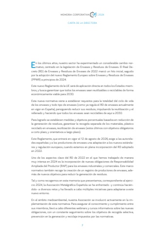 7En los %u00faltimos a%u00f1os, nuestro sector ha experimentado un considerable cambio normativo, centrado en la legislaci%u00f3n de Envases y Residuos de Envases. El Real Decreto (RD) de Envases y Residuos de Envases de 2022 marc%u00f3 un hito inicial, seguido por la adopci%u00f3n del nuevo Reglamento Europeo sobre Envases y Residuos de Envases (PPWR) a principios de 2024.Este nuevo Reglamento de la UE ser%u00e1 de aplicaci%u00f3n directa en todos los Estados miembros, y busca garantizar que todos los envases sean reutilizables o reciclables de forma econ%u00f3micamente viable para 2030.Esta nueva normativa viene a establecer requisitos para la totalidad del ciclo de vida de los envases y todo tipo de envases (como ya regula el RD de envases actualmente en vigor en Espa%u00f1a), persiguiendo reducir sus residuos, impulsando la reutilizaci%u00f3n y el rellenado y haciendo que todos los envases sean reciclables de aqu%u00ed a 2030. Para lograrlo se establecen medidas y objetivos porcentuales basados en: reducci%u00f3n de la generaci%u00f3n de residuos, garantizar la recogida separada de los materiales, pl%u00e1stico reciclado en envases, reutilizaci%u00f3n de envases (estos %u00faltimos con objetivos obligatorios a corto plazo, y orientativos a largo plazo). Este Reglamento, que entrar%u00e1 en vigor el 12 de agosto de 2026, exige a las autoridades espa%u00f1olas y a los productores de envases una adaptaci%u00f3n a los nuevos est%u00e1ndares y regulaci%u00f3n europeos, cuando estamos en plena incorporaci%u00f3n del RD adoptado en 2022. Uno de los aspectos clave del RD de 2022 en el que hemos trabajado de manera muy intensa en 2024 es la incorporaci%u00f3n de nuevas obligaciones de Responsabilidad Ampliada del Productor (RAP) para los envases industriales y comerciales. Este marco normativo tambi%u00e9n recoge la creaci%u00f3n de un registro de productores de envases, adem%u00e1s de nuevos objetivos para reducir la generaci%u00f3n de residuos.Tal y como recogemos en esta memoria que presentamos, correspondiente al ejercicio 2024, la Asociaci%u00f3n Metalgr%u00e1fica Espa%u00f1ola se ha enfrentado -y contin%u00faa haci%u00e9ndolo- a diversos retos y ha llevado a cabo m%u00faltiples iniciativas para adaptarse a este nuevo entorno. En el %u00e1mbito medioambiental, nuestra Asociaci%u00f3n se involucr%u00f3 activamente en la implementaci%u00f3n de esta normativa. Para asegurar el conocimiento y cumplimiento entre sus miembros, llev%u00f3 a cabo diferentes webinars y cursos informativos sobre las nuevas obligaciones, con un constante seguimiento sobre los objetivos de recogida selectiva, prevenci%u00f3n en la generaci%u00f3n y reciclaje impuestos por las normativas.MEMORIA CORPORATIVA 2024CARTA DE LA DIRECTORA